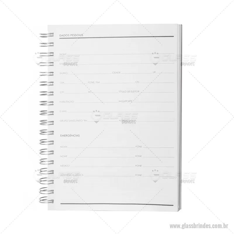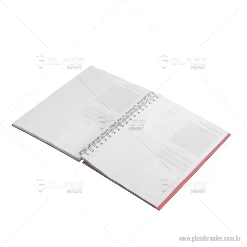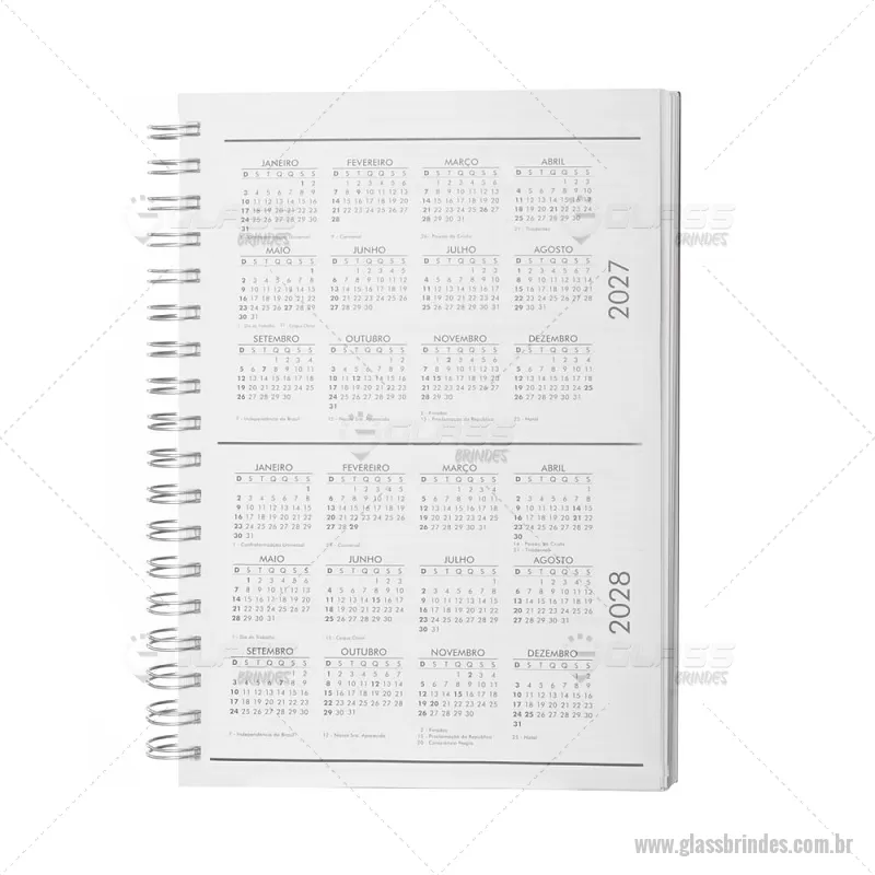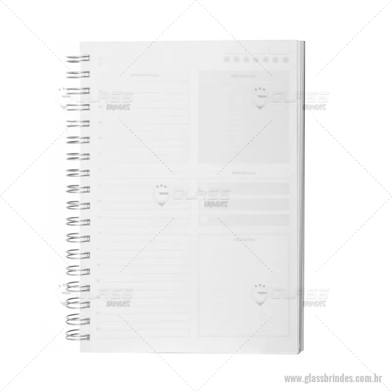 Caderno planner em espiral com capa rígida em Percalux de 2 mm. Possui 90 folhas brancas de 95 g/m² com layout de planner, ideais para organização e controle da rotina. Inclui páginas de dados pessoais, calendários de 2025 a 2028 e espaços para anotações mensais. - - GLACAD034