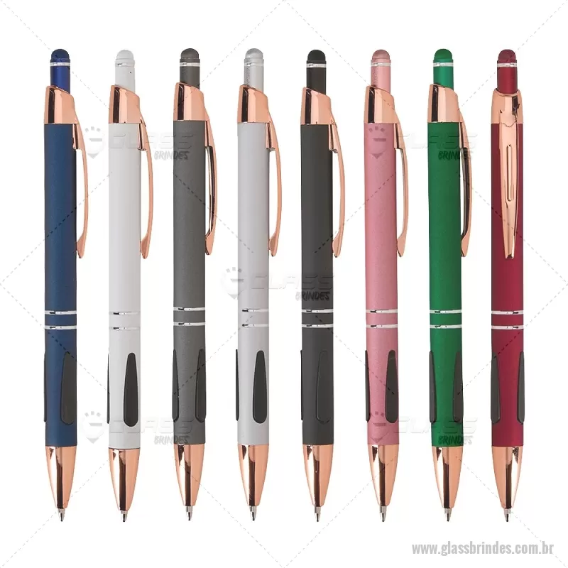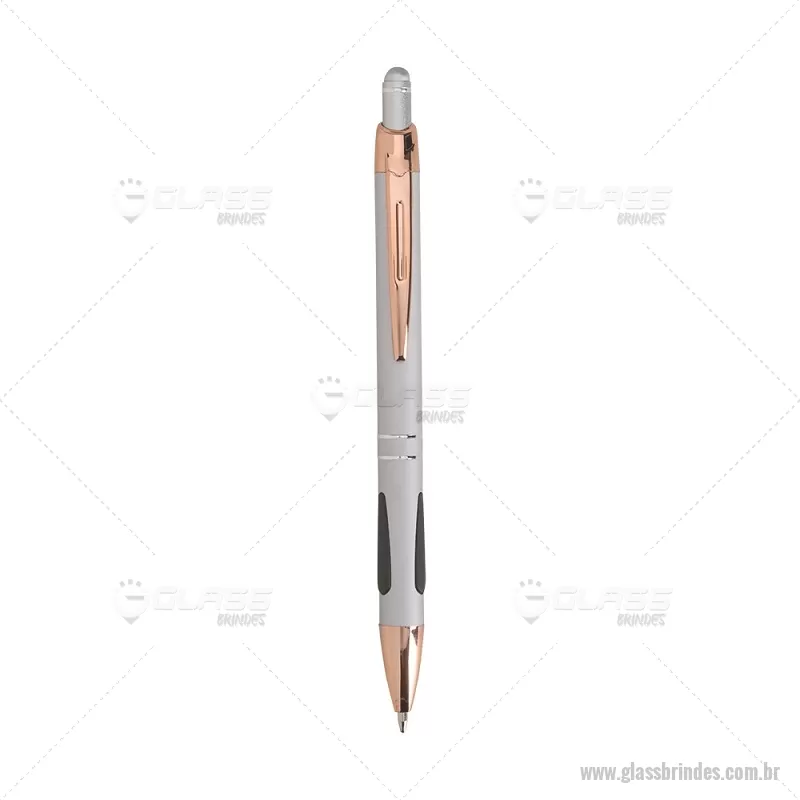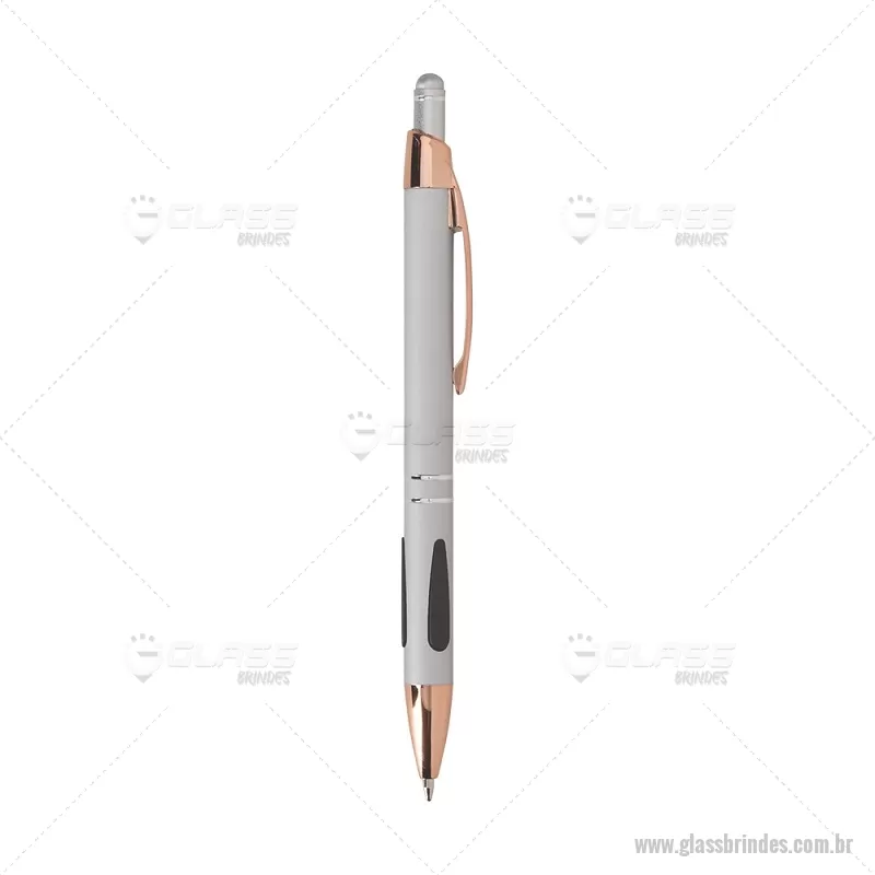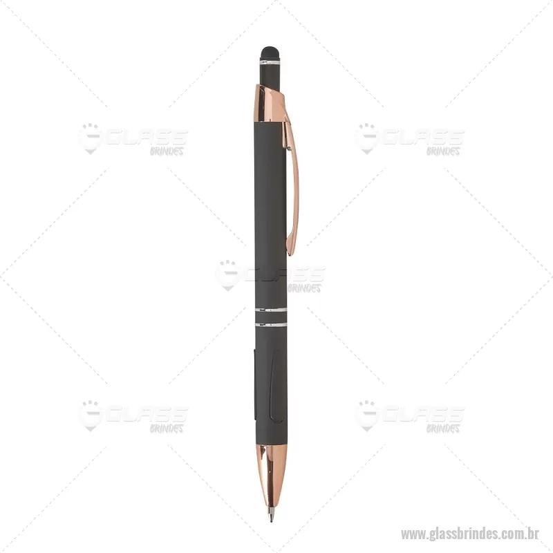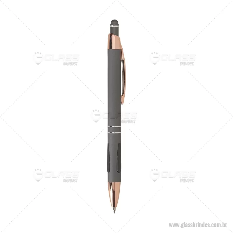 Caneta em metal com detalhes emborrachados, carga esferográfica azul 1,0 mm e acionamento por clique. Possui ponta touch emborrachada para uso em telas sensíveis ao toque, unindo escrita e praticidade em um só item. - - GLACMT295