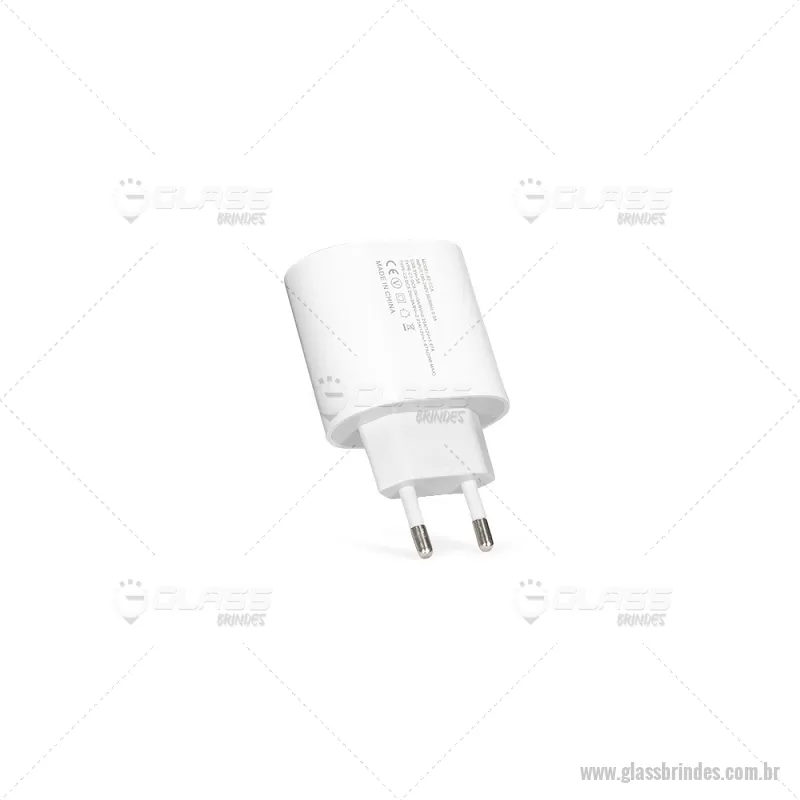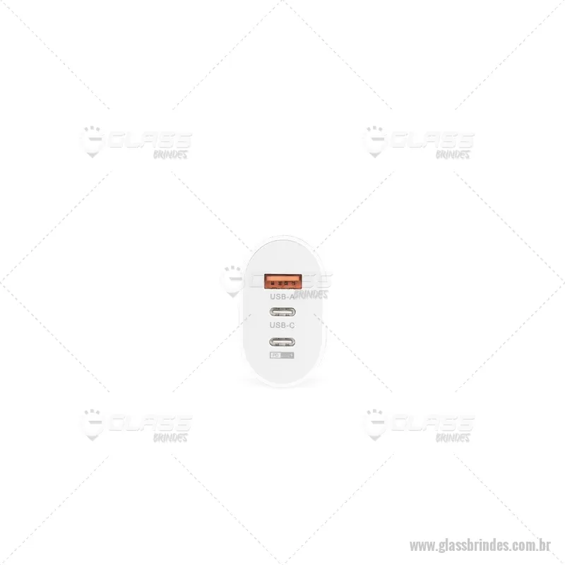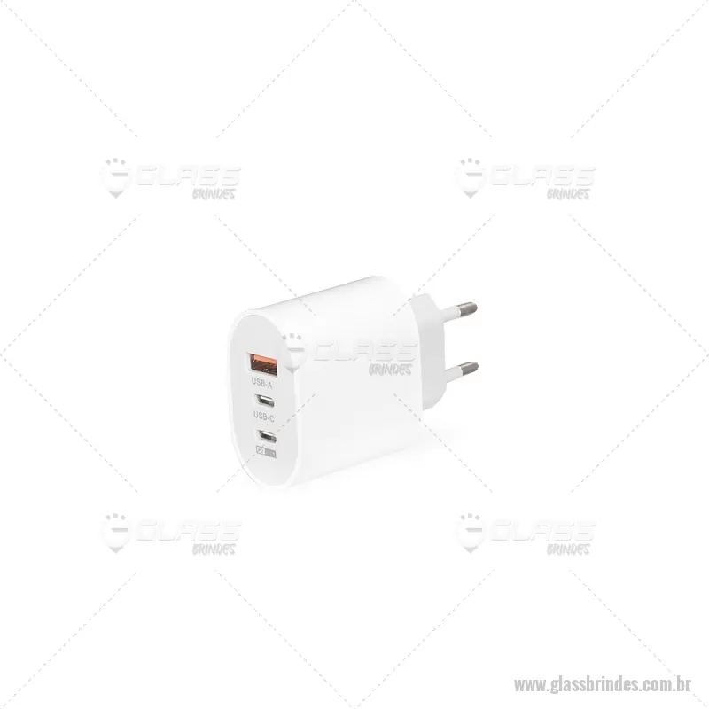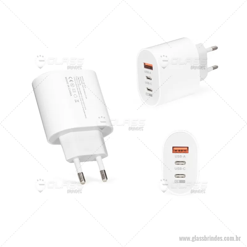 Carregador rápido em plástico leve e compacto, com três portas: uma USB-A e duas USB-C, incluindo uma opção de carregamento rápido de 20W. Ideal para recarregar diferentes dispositivos com praticidade. Cabo USB não incluído. - - GLATEC535