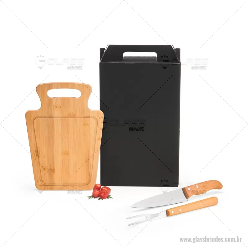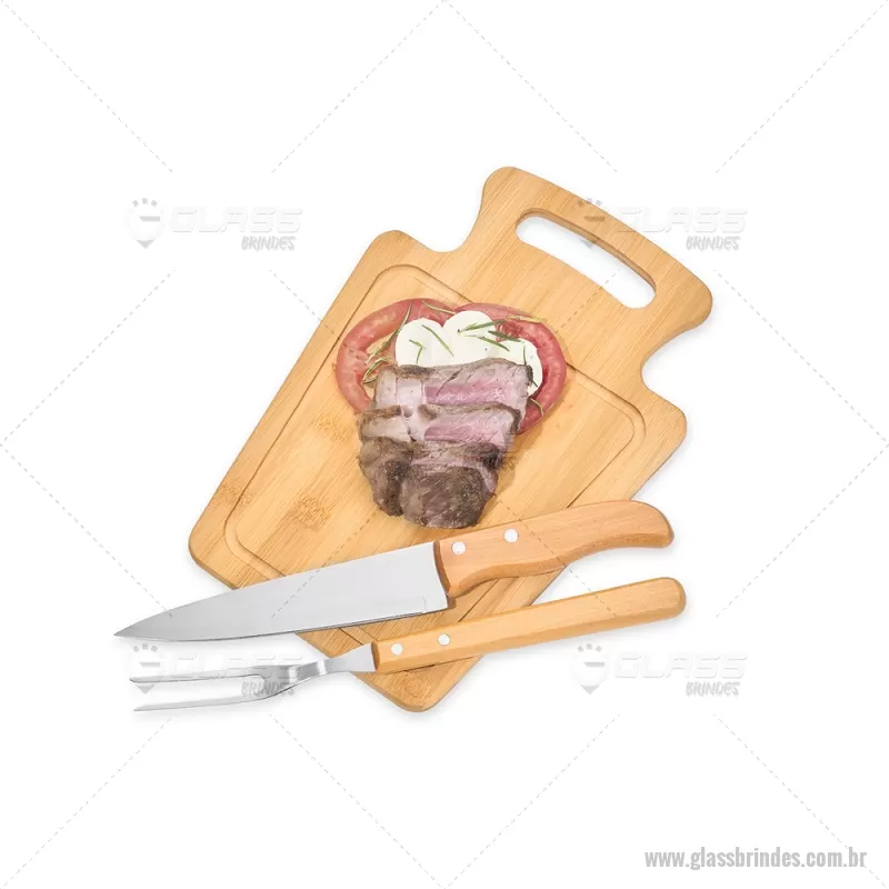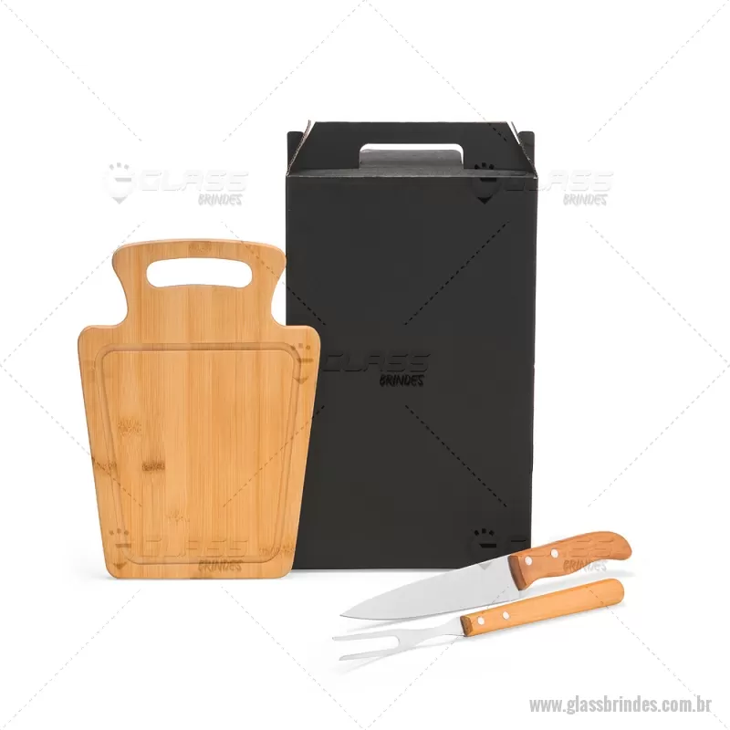 Conjunto Para Churrasco Em Bambu / Madeira / Inox - 3 Pçs Composto por tábua em Bambu com 30x21x1,2 cm; faca 7'' e garfo em Madeira/Inox. Dimensões do Produto Tábua: 30x21x1,3 cm Sugestão de Personalização Uma gravação a Laser na petisqueira e lâmina da faca; uma gravação em Silk/Digital na caixa. Embalagem : Caixa Preta 40x21,8x4,5 cm (AxLxP) Peso: 619 g (com embalagem) - - GLAKCH095
