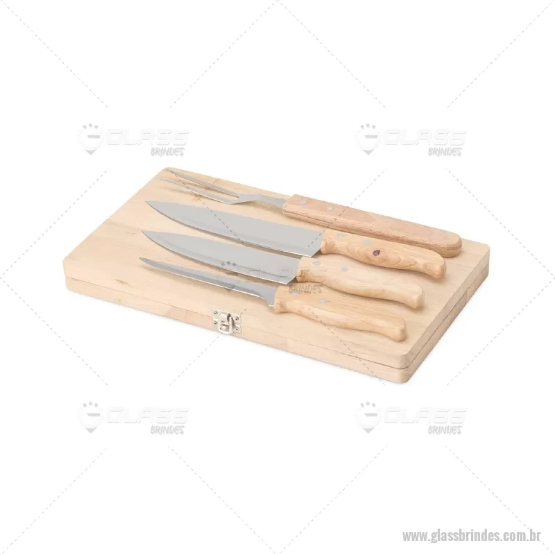 Kit Churrasco com 4 Peças e Estojo de madeira. Brinde ideal para quem curte passar o fim de semana cercado da família e amigos. Kit churrasco 4 peças em estojo de madeira. Contém três facas e um garfo. Altura : 3 cm x Largura : 35,4 cm x Profundidade : 19,8 cm Peso aproximado (g): 1449 - - GLAKCH040