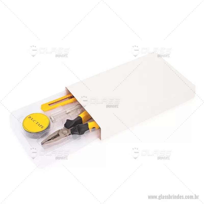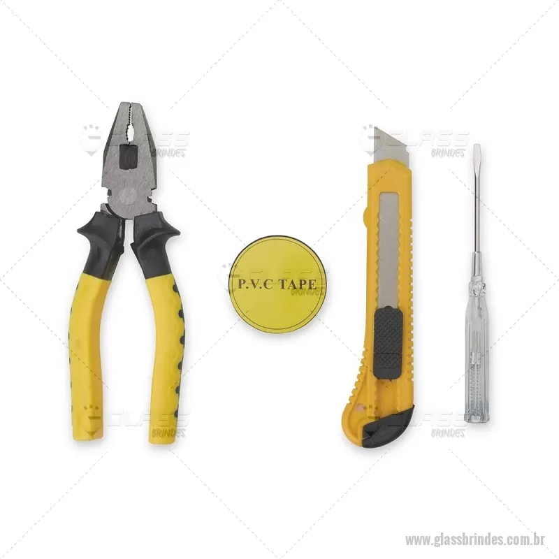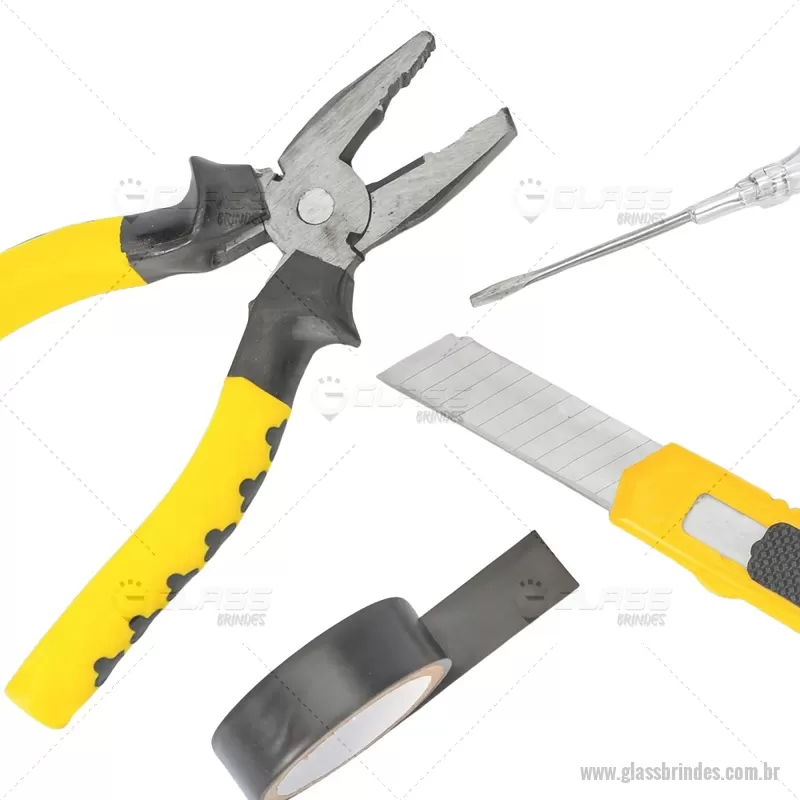 Kit de ferramentas compacto para uso diário, composto por chave de fenda teste, estilete, alicate e fita PVC. Todas as peças possuem acabamento em plástico resistente, oferecendo praticidade, conforto e durabilidade para pequenos reparos e imprevistos do dia a dia. - - GLAFER066