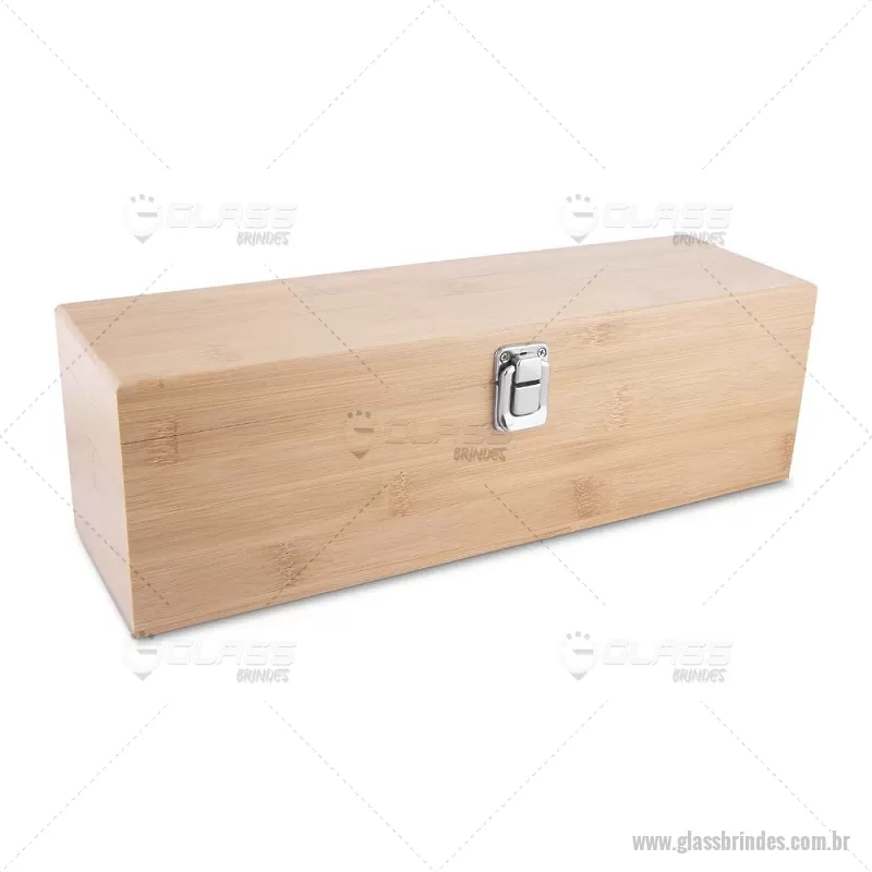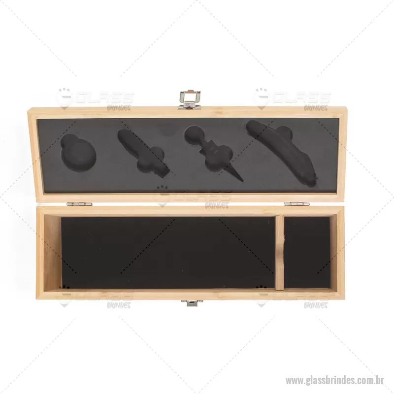 Kit Vinho em bambu com interior em EVA e fecho em inox, suporte para garrafa de vinho de 750 ml (padrão). Contém: saca-rolha de metal com detalhes em bambu e cortador de lacre, anel corta-gotas de metal, bico para servir de metal com tampa em bambu e tampa de metal com detalhe em bambu. Peso do Produto: 0,997kg Dimensão do Produto: 11x36x11cm *Não acompanha garrafa vinho, imagem meramente ilustrativa. - - GLAKVI051