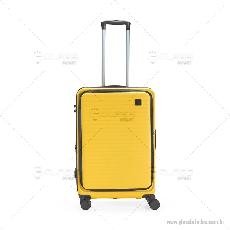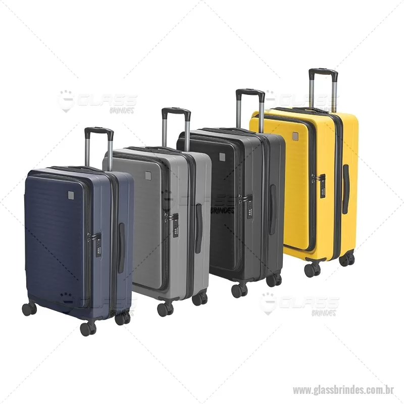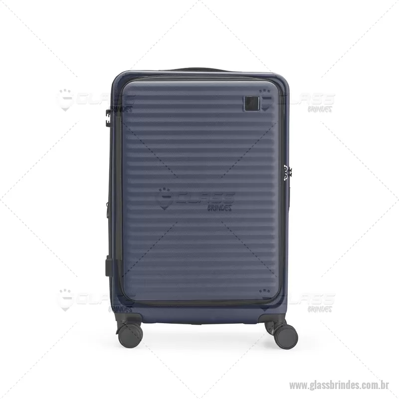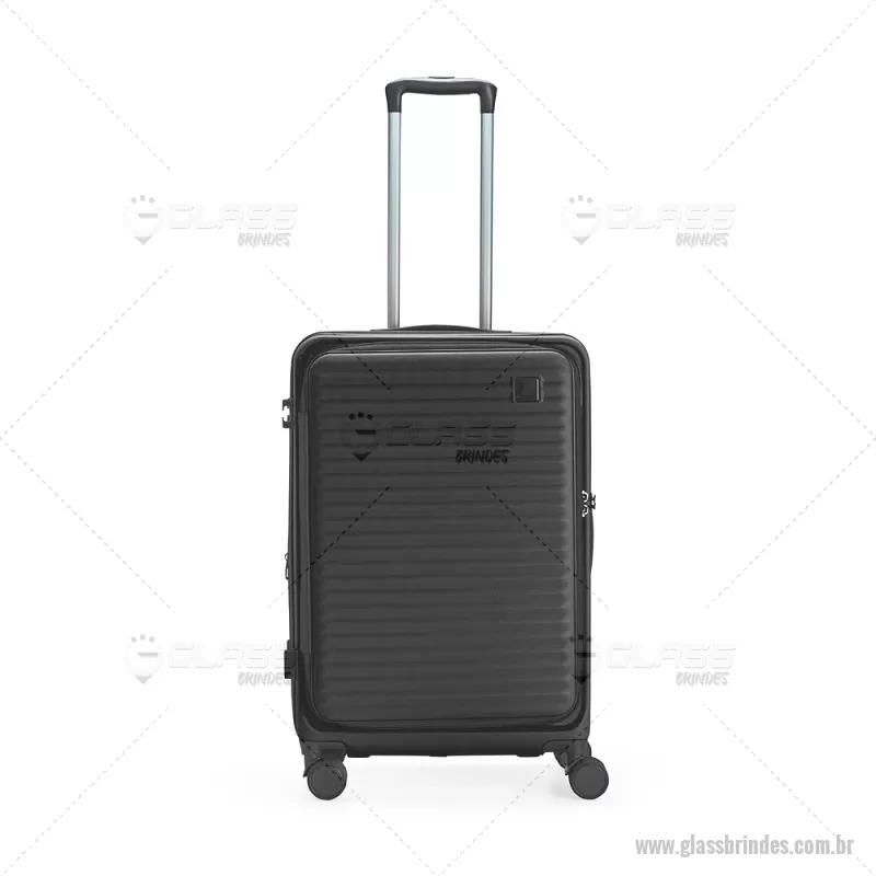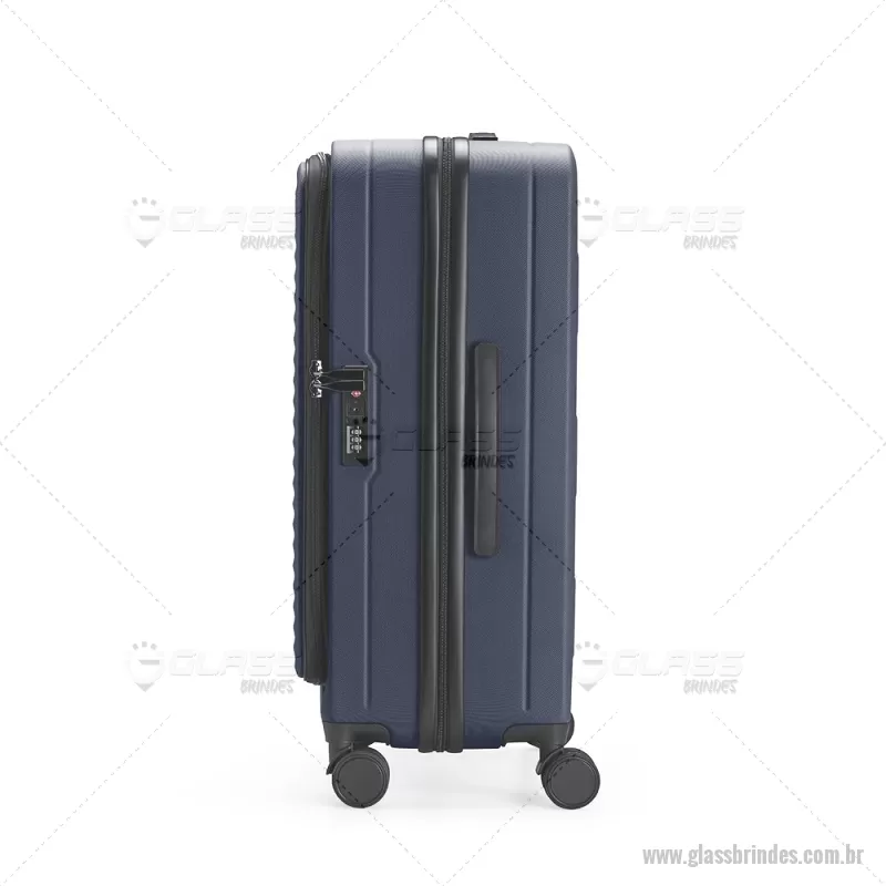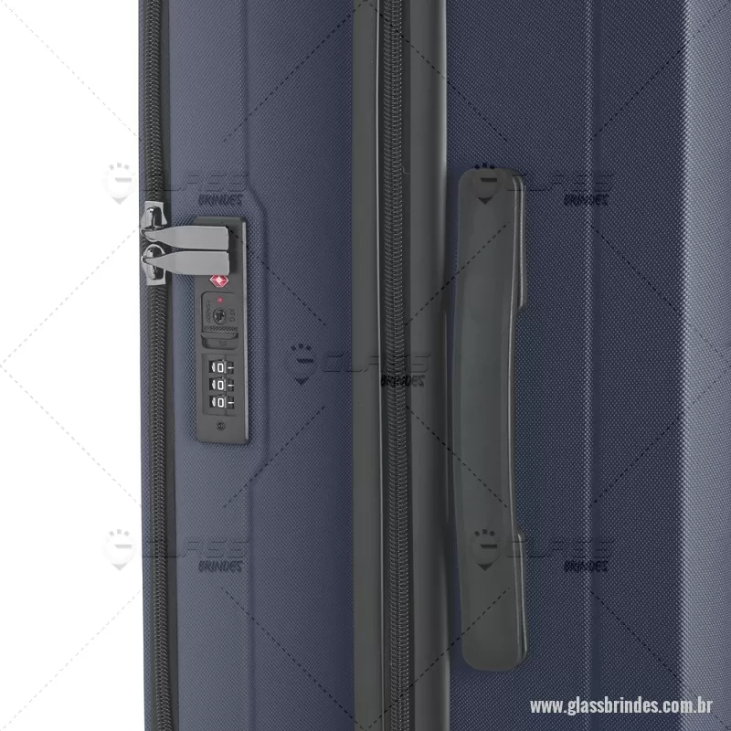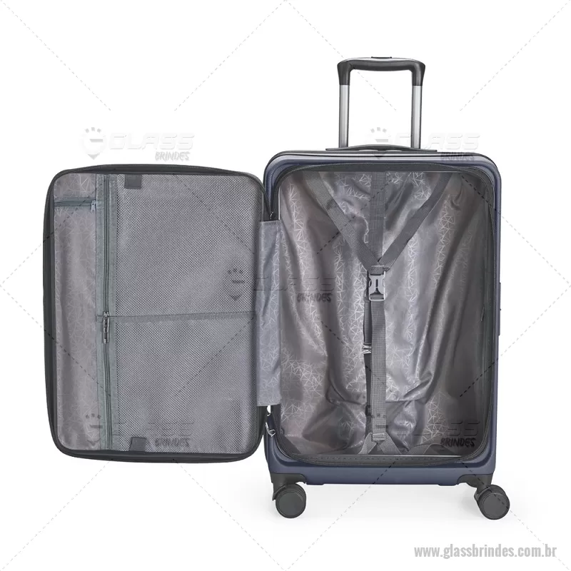 Mala de viagem com capacidade de 66 litros, fabricada em plástico ABS resistente e equipada com cadeado TSA embutido para maior segurança. Possui abertura frontal com compartimentos internos organizadores, zíperes e cinta compressora, além de zíper expansível que amplia o espaço interno. Conta com puxador retrátil de três níveis, duas alças de mão, apoios e ganchos laterais, além de rodinhas com giro 360° para deslocamento fácil. Acompanha plaquinha metálica grafite para personalização. - - GLAMC250