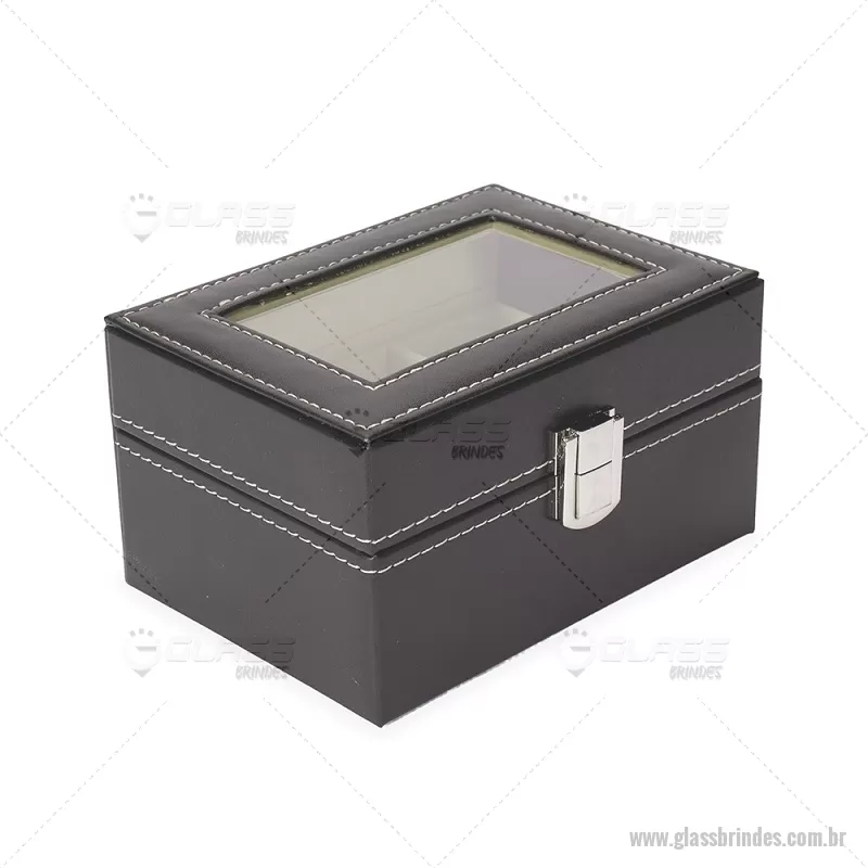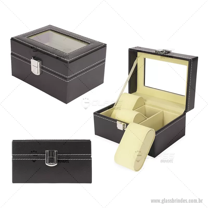 Estojo porta relógios com acabamento externo em couro sintético à base de PVC e interior revestido em veludo macio. Possui duas divisórias com almofadas removíveis para acomodar os relógios, tampa com visor de vidro e fecho com trava de segurança, garantindo proteção e organização com elegância. - - GLAPREL002