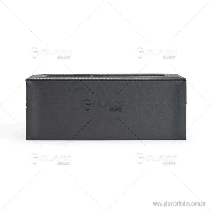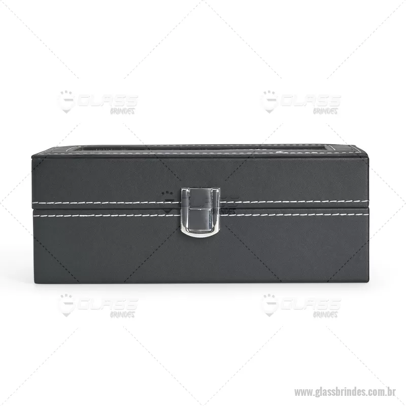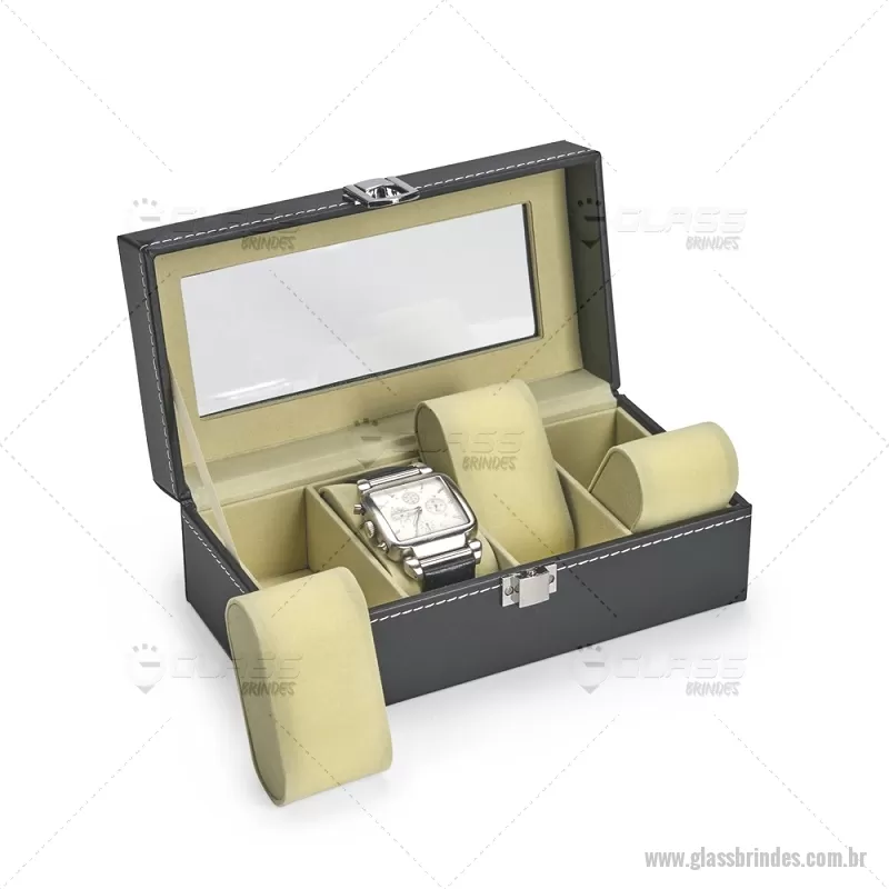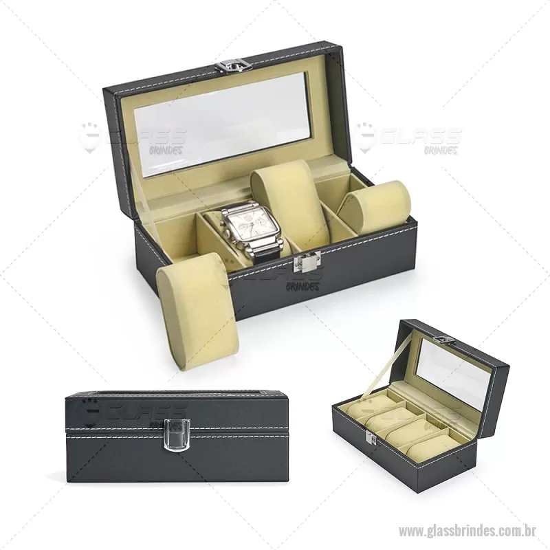 Porta-relógios com acabamento em couro sintético em PVC e interior forrado em veludo. Possui quatro compartimentos com almofadas de espuma removíveis, visor superior em vidro e trava de segurança, ideal para organizar e proteger relógios com elegância. - - GLAPREL003