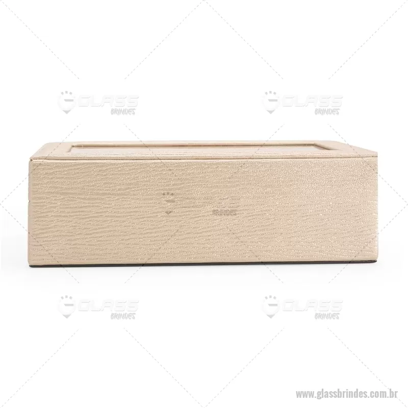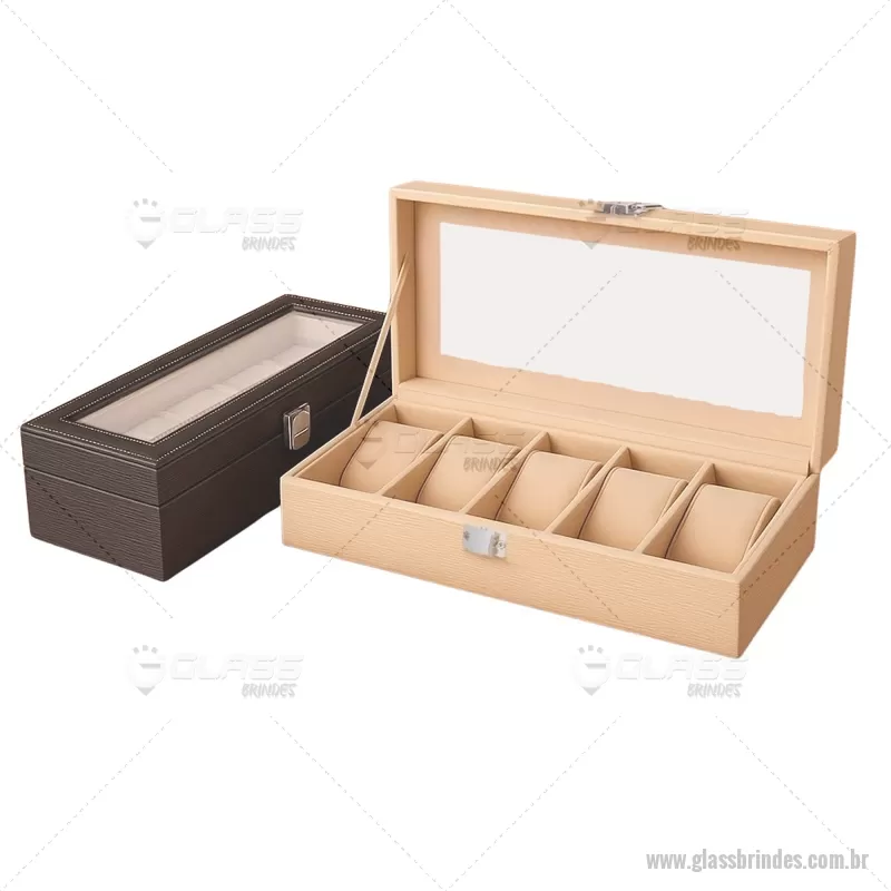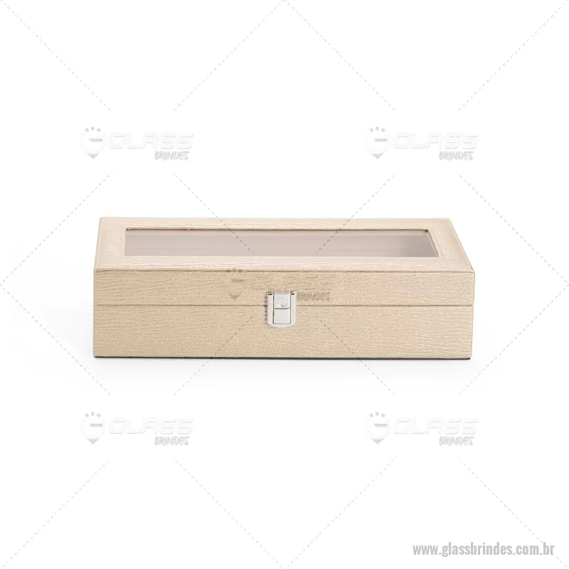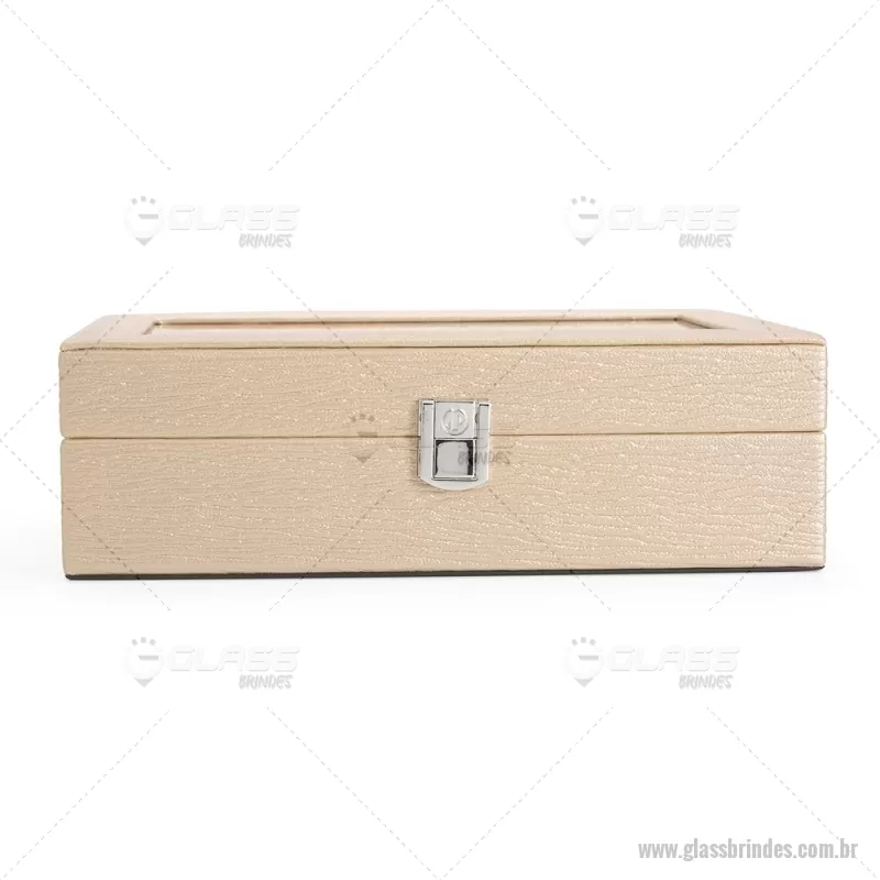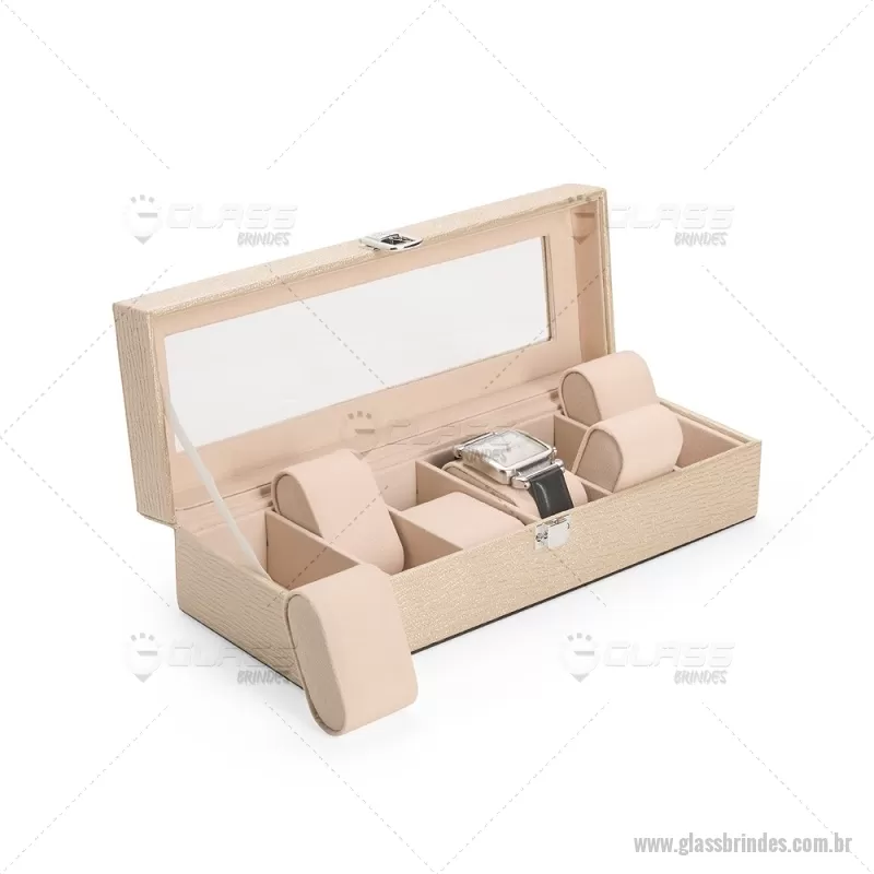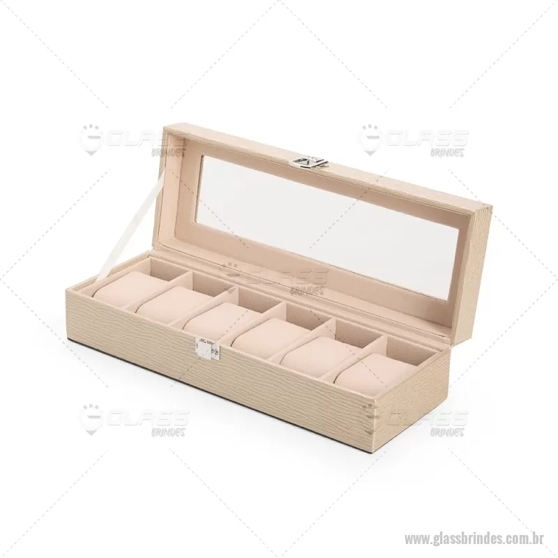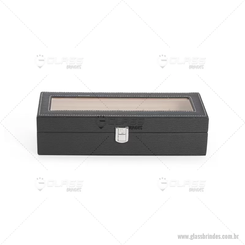 Porta-relógios com acabamento em couro sintético texturizado à base de PVC e interior revestido em tecido aveludado. Possui seis compartimentos com almofadas removíveis, visor em vidro transparente e trava de segurança, ideal para organizar e proteger relógios com elegância. - - GLAPREL004