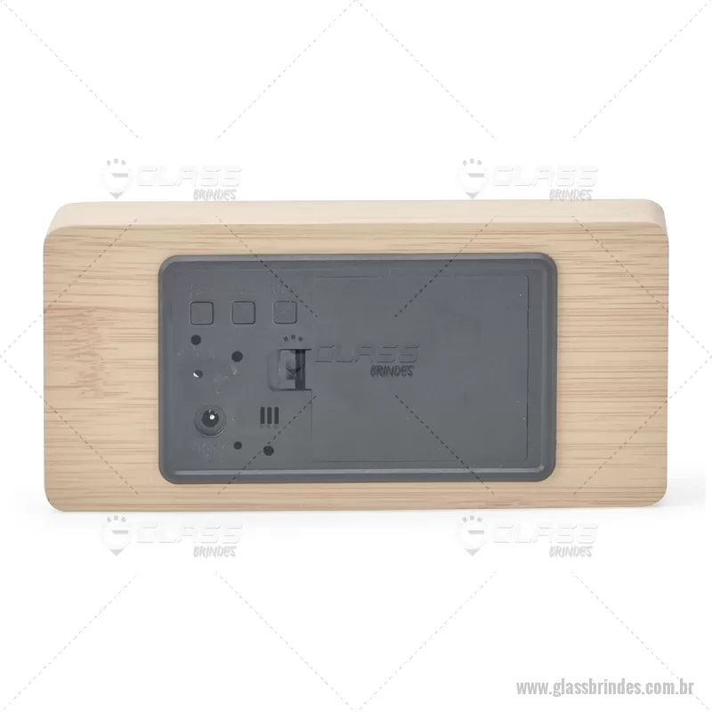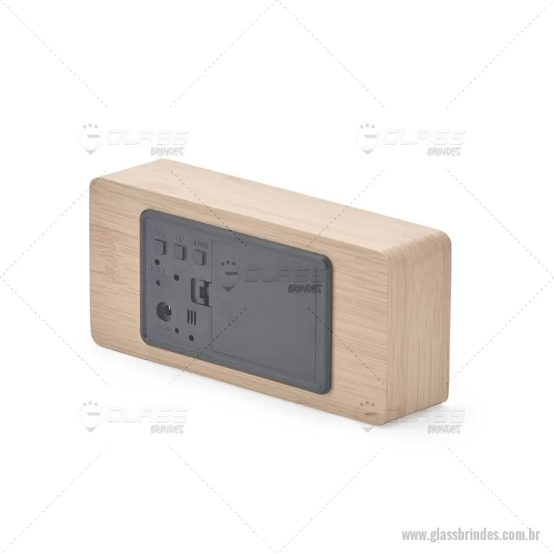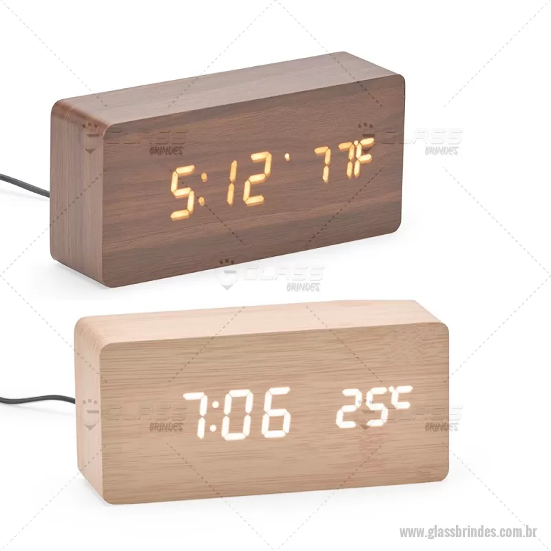 Relógio despertador em madeira com display LED, que combina design elegante e tecnologia moderna. Exibe horas, data e temperatura ambiente, além de permitir a programação de até três alarmes com diferentes configurações. Pode ser alimentado por 4 pilhas AAA (não inclusas) ou por cabo USB DC 5V, que acompanha o produto, oferecendo praticidade para o uso diário. - - GLAREL023